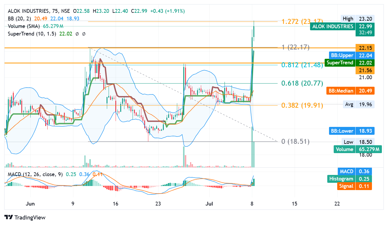 Alok Industries Ltd, a vertically integrated textile and polyester giant, has suddenly surged back into market focus following a sharp intraday rally on July 8, 2025. The stock price spiked nearly 15% during the day before stabilizing around ₹22.99. This rally came on unusually high volumes and a confirmed technical breakout, attracting attention from both retail and institutional investors.