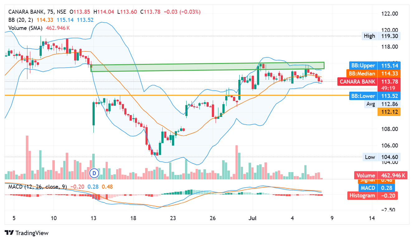 Canara Bank is currently trading around ₹113.78 as of July 8, 2025. The stock has witnessed marginal volatility in recent sessions, moving within a tight range between ₹113 and ₹115. The daily price movement has turned largely sideways, reflecting investor caution and the absence of strong directional cues.