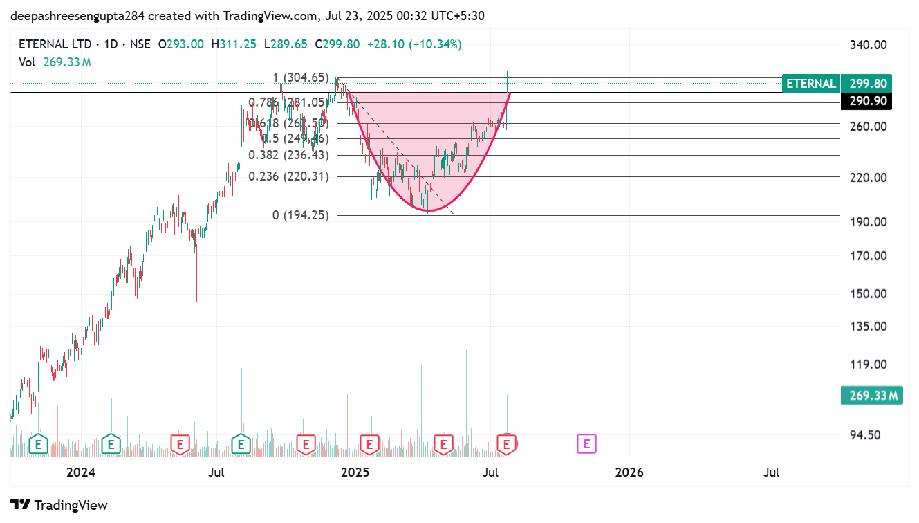 Eternal Ltd’s price structure over the past few months formed a textbook “Cup and Handle” pattern—a classic bullish continuation formation. On July 22, the stock broke above the lip of the cup, piercing through the resistance zone at Rs. 294–Rs. 304.65 with heavy volume. This signals a strong bullish reversal and breakout momentum.