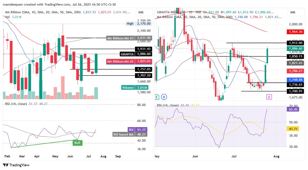 The latest chart for Gravita India (as of July 26, 2025) reveals a strong breakout both on the daily and weekly timeframes, supported by volume, momentum, and price structure alignment.