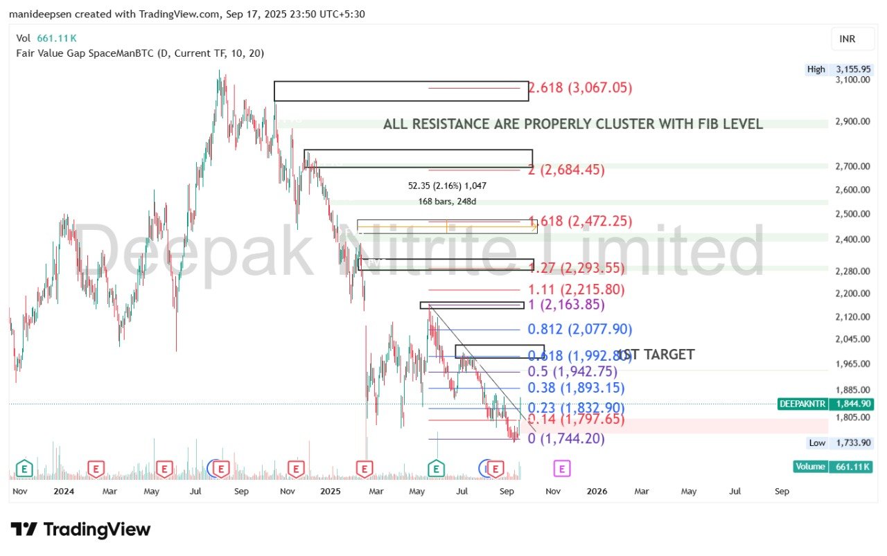 Deepak Nitrite Limited (NSE: DEEPAKNTR), one of India’s leading chemical manufacturing companies, has been under significant selling pressure since hitting its all-time high near the ₹3,100–3,150 zone. The stock has corrected sharply, testing lower supports, and is currently trading around ₹1,845.90 (as per the chart). A detailed technical analysis using Fibonacci retracement and extension levels shows that the stock is approaching a critical zone where both upside and downside targets are clearly defined.